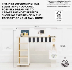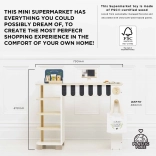 - Bohatá výbava: pokladňa, pásový dopravník, skener, hracie peniaze, platobné/odmeňovacie/vernostné karty, tabuľa a špeciálna ponuka, nápis „ďalší zákazník“, bavlnená nákupná taška, regál a mix potravín (nápoj, lupienky, kečup, horčica, cestoviny a pod.).