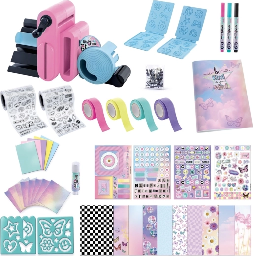 Súčasťou je viac než 150 doplnkov: archy papierov, čiernobiele aj farebné samolepky, fixky, trblietavé lepidlá, dekoratívne pásky a tematické šablóny s motívmi kvetov, motýľov, hviezd a nápismi ako „Be Happy“ či „Cool“. V balení nájdete aj malý zápisník na okamžité použitie novovytvorených dekorácií.