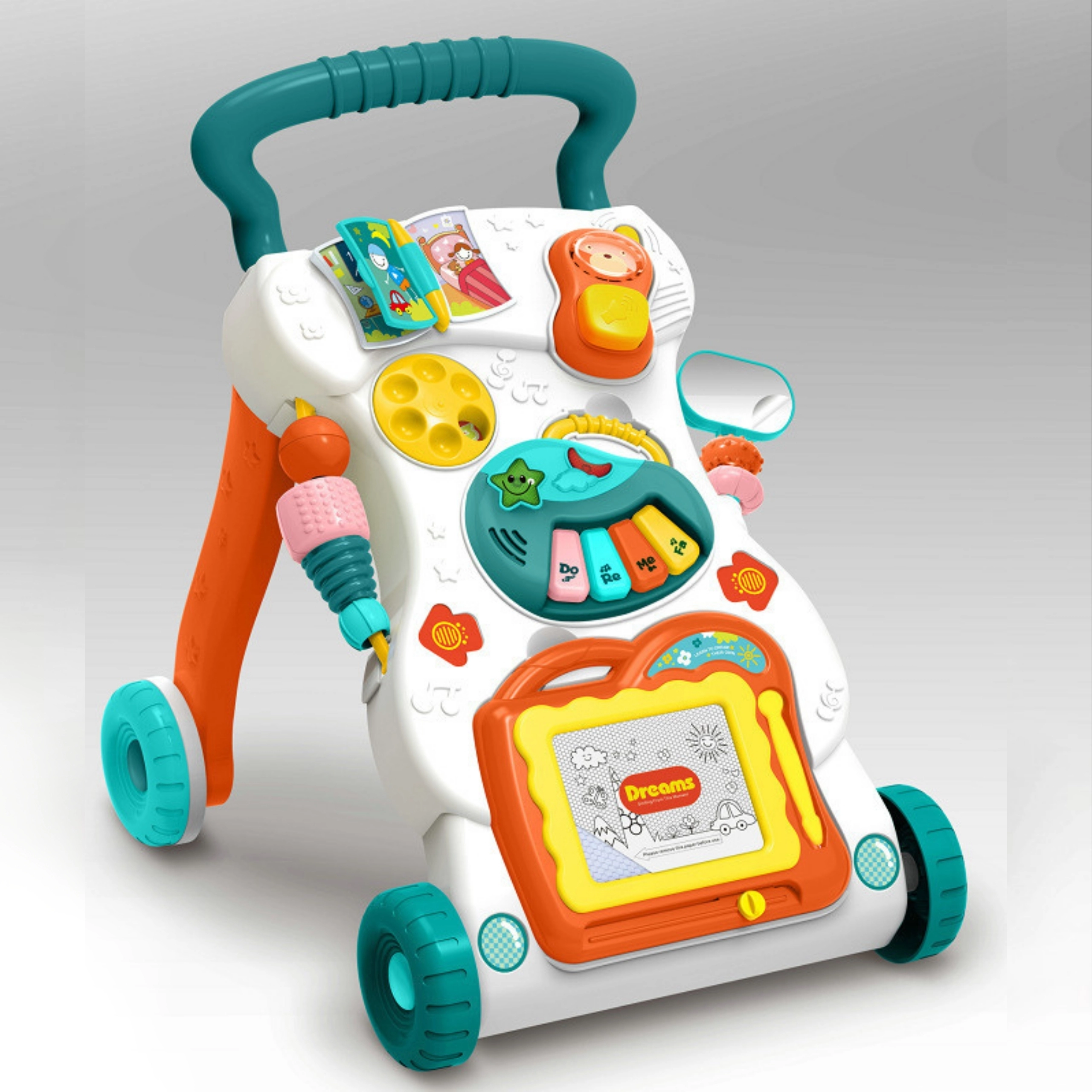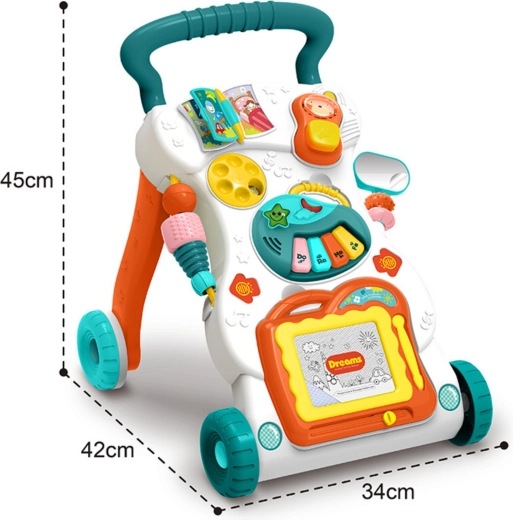 - 2v1: chodítko/pchací vozík + odnímateľný edukačný panel