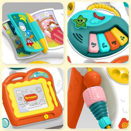 Súčasťou je znikopis (magnetická kresliaca tabuľka) na nekonečné kreslenie bez neporiadku, pianínko s melódiami, bezpečné zrkadielko, farebná knižka a odnímateľný telefón fungujúci aj ako samostatná hračka. Košík a 3 loptičky pozývajú k ďalším hrám a precvičovaniu koordinácie.