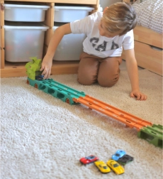 Deti si zamilujú dlhú trať pre svoje autíčka, ktorá poskytuje dostatok priestoru pre napínavé preteky a neobmedzenú predstavivosť.