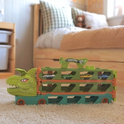 Zábavný nákladný voz Dino je skvelou voľbou pre deti od 3 rokov. Obsahuje nákladiak premeniteľný na pretekársku trať s motívom dinosaura, ktorý prináša nespočet zábavy. Systém launcheru umožňuje autíčka katapultovať vpred stlačením tlačidla na hlave dinosaura.