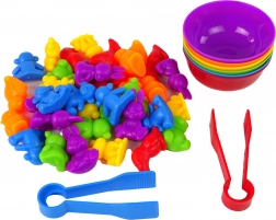 Tento farebný montessori set prináša jednoduchú, ale veľmi účinnú formu vzdelávania. Deti vysypú figúrky na stôl a pomocou klieštikov ich priraďujú do misiek podľa farby, čím rozvíjajú koordináciu oko–ruka, sústredenie a logické myslenie. Gumové figúrky sú príjemné na dotyk a bezpečné pre malé detské ruky.