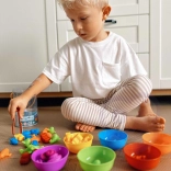 Šesť farebných misiek a 36 gumových figúrok pomáha deťom intuitívne si osvojiť farby aj základné matematické pojmy.