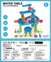 Obsah balenia: 2× vedro, 1× krhlička, 5× formička, 1× jednoduchý mlynček, 5× náradie do piesku (napr. lopatka, hrable, sitko), vodný/pieskový stolík s montážnymi doplnkami, 1× stolička.