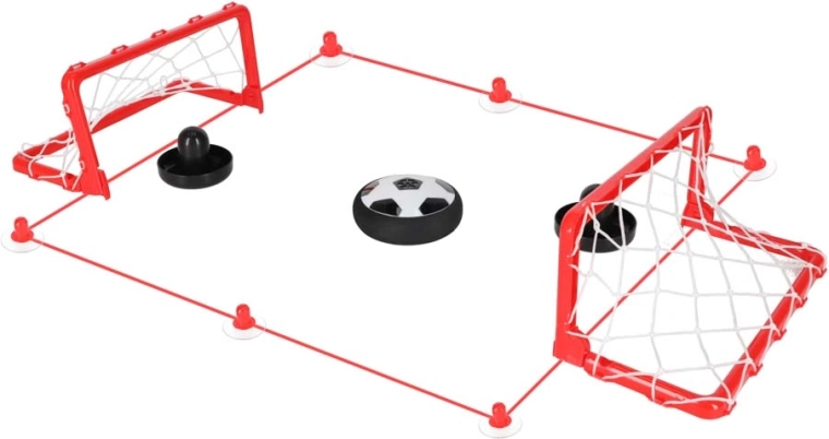 Zábavná indoor hra spájajúca hoverball a air hockey pre dvoch hráčov. Levitujúca lopta s LED osvetlením vďaka vzduchovému vankúšu hladko kĺže po stole, mäkký nárazník chráni nábytok a prísavky so šnúrou rýchlo vymedzia ihrisko. Ideálne na rýchle rodinné zápasy, rozvoj koordinácie a zručnosti detí od 3 rokov.