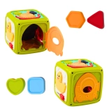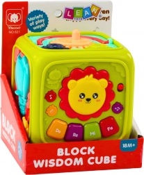 Interaktívna kocka obsahuje hudobné prvky, ako sú klávesy s melódiami a priateľského leva, ktorý povzbudzuje k interakcii. Nájdete tu tiež triediace tvary, pohyblivé dvere, otočné prvky a veselé grafiky so zvieratkami. Hračka prehráva zvuky a piesne, ktoré stimulujú zmysly a rozvoj sluchu u tých najmenších.
