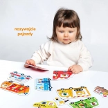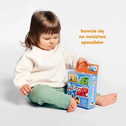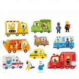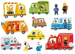 Zábavná sada prvých puzzle pre najmenších: 8 dvojdielnych obrázkov farebných vozidiel a 4 figúrky postavičiek pre ešte viac hrania. Rozvoj jemnej motoriky, tréning pozornosti a učenie nových slov v jednej hre. Tradičné spájanie dielikov uľahčí začiatky a hotové obrázky lákajú k ďalším aktivitám.