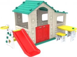 Veľký detský domček určený na záhradu ponúka množstvo zábavy so šmykľavkou, basketbalovým košom a praktickým stolíkom. Vyrobený z vysokokvalitného HDPE materiálu pre väčšiu odolnosť.