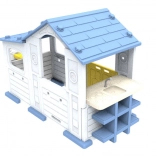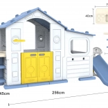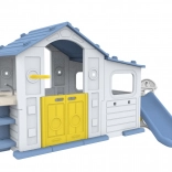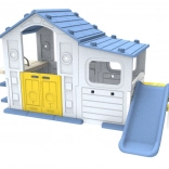 Veľký detský domček s predsieňou, šmýkačkou a drezom s modrou strechou ponúka priestranné miesto na hru a bezpečnú dvojvrstvovú šmýkačku. Je vyrobený z odolného HDPE s dvojitými stenami pre vyššiu stabilitu, má drez s policami, široké schody a basketbalový kôš s loptou – ideálny na záhradu aj do domu.