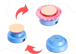 Súprava obsahuje farebne atraktívny hrnčiarsky kruh, ktorý je určený na modelovanie hliny a zdobenie.