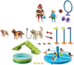 - 2 figúrky detí, niekoľko psov, prekážky (kruh, slalom, hojdačka/lávka, rampy), doplnky