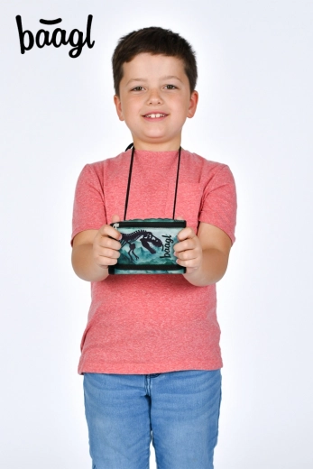 Štýlová detská peňaženka Baagl s motívom dinosaura a možnosťou zavesenia na krk ponúka praktické členenie a bezpečné nosenie. Vďaka nastaviteľnej šnúrke s poistkou, zapínaniu na suchý zips a samostatnému vrecku na drobné je ideálna na každodenné používanie do školy aj na krúžky. Vyrobená z odolného recyklovaného materiálu.