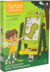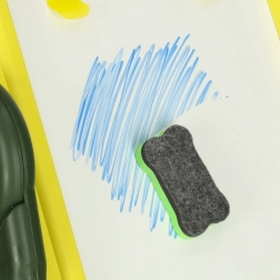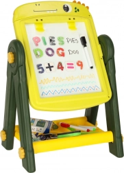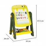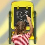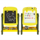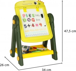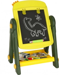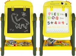 Táto obojstranná edukačná tabuľa je ideálnym nástrojom na rozvoj kreativity a učenia u detí. Na jednej strane sa nachádza magnetický biely povrch, ktorý umožňuje suchostierateľné maľovanie a písanie fixkami, zatiaľ čo druhá strana slúži ako klasická čierna tabuľa na kreslenie kriedou. Ozdobená veselým dinosauřím motívom, táto tabuľa očarí každé dieťa svojou farebnosťou a možnosťami využitia.
