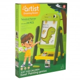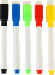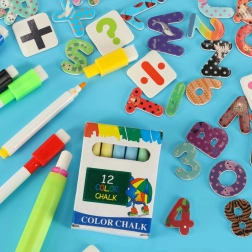Súčasťou sú rôzne učebné pomôcky ako magnetické písmená, čísla, kriedy a fixky.