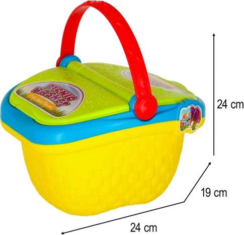 - Piknikový kôš s víčkami, plastové ovocie, kartóniky s džúsom, fľaštičky, pohárik na shake, pikniková podložka, samolepky, návod