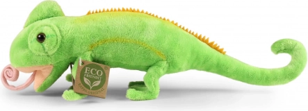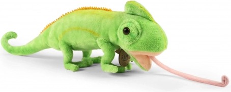 Vyšívané prvky, oranžové chrbtové ostne a roztomilý ružový jazýček robia z chameleóna verného plyšového kamaráta.