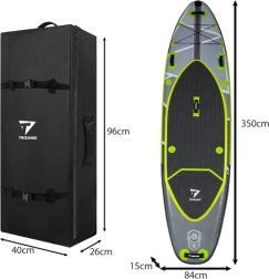 Výnimočná paddle board SUP Trizand s dĺžkou 350 cm je skvelou voľbou pre začiatočníkov. Vďaka svojej širokej a stabilnej konštrukcii ponúka jednoduchú manipuláciu a bezpečnosť pri prvých jazdách. Získajte všetko, čo potrebujete na jazdu vďaka kompletnému setu s regulovateľným pádlem, sedadlom, pumpou a doplnkovými položkami.