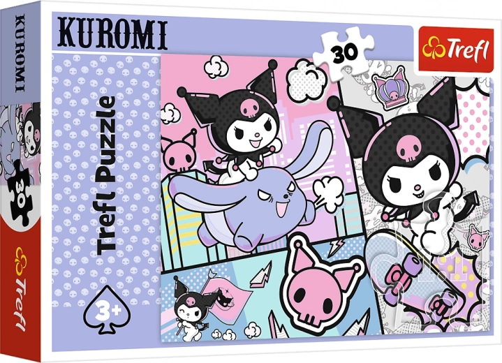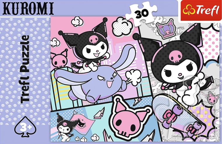 Roztomilé puzzle s motívom KUROMI poteší malých aj veľkých fanúšikov. Obsahuje 30 dielikov a po poskladaní vytvorí obrázok s rozmerom 27 × 20 cm. Ideálne na krátku zábavu, rozvoj jemnej motoriky a trpezlivosti.
