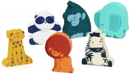 Drevené figúrky sú pevné, ideálne do detských rúk a plné zábavy bez obrazoviek, s dôrazom na samostatné objavovanie. Postavičky sú uskladnené v krásnom drevenom boxe s motívmi prírody a priezormi, ktoré prinesú kúsok divočiny priamo do detskej izby. Sada obsahuje: 6 figúrok – lev, panda, gorila, slon, zebra a leopard.