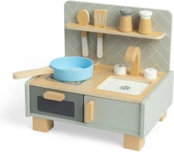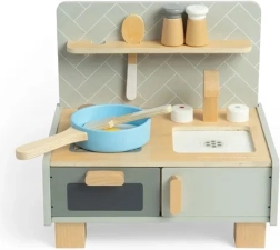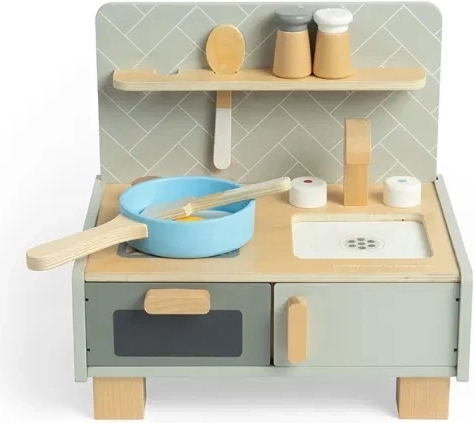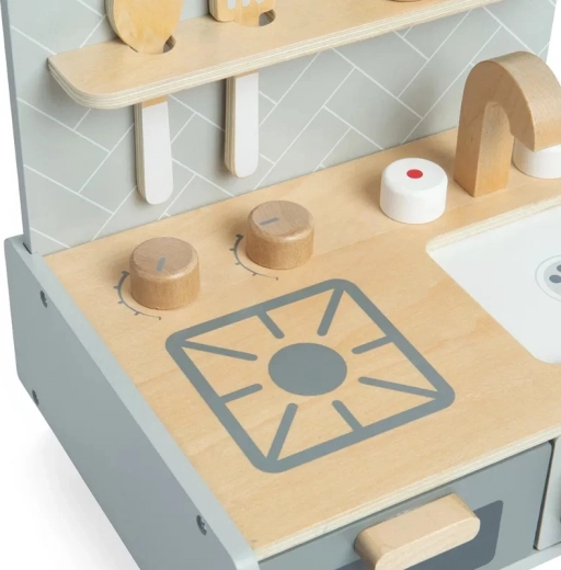Kompaktný dizajn v jemných neutrálnych farbách sa skvele hodí do každého detského izby či herne. Je vyrobená z FSC® certifikovaného dreva a farbená netoxickými farbami, čo zaručuje udržateľnú a bezpečnú zábavu pre deti od 3 rokov. Okrem zábavy táto kuchynka podporuje rozvoj fantázie a predstavivosti, zatiaľ čo deti napodobňujú kuchynské role.