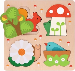 Objavte kúzlo prírody s Petit Collage vkladacím puzzle, ktoré vaše deti nadchne. Toto viacvrstvové, osmidielne puzzle predstavuje domovy obľúbených zvieratiek, ako sú žabky, vtáčiky, veveričky a slimáky. Rozložte každý dielik a nájdite správne miesto pre každý zvierací domov.