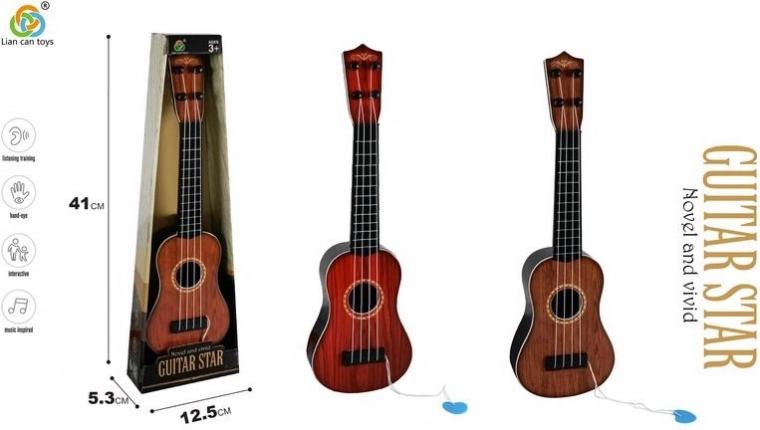 Táto detská gitara je skvelým nástrojom pre rozvoj hudobných schopností u detí. S dĺžkou 36 cm je ľahko uchopiteľná a prispôsobená malým rukám.