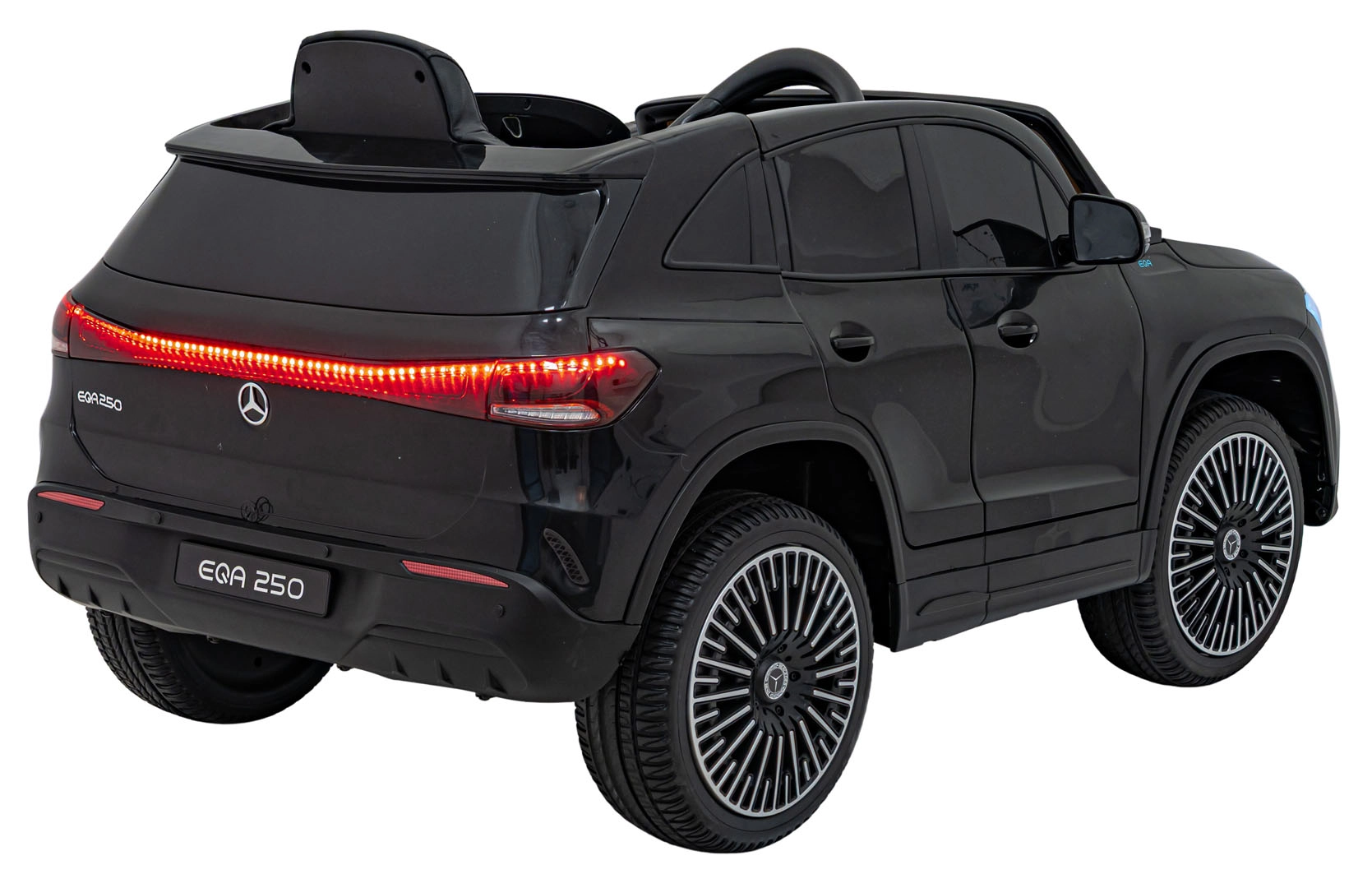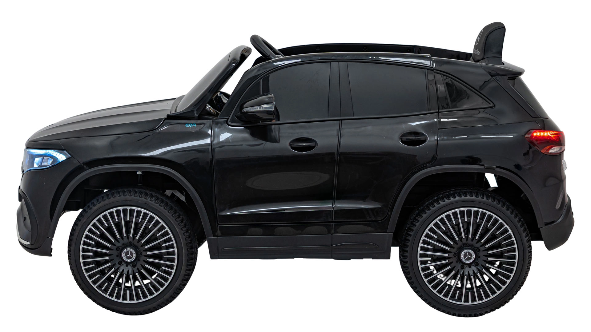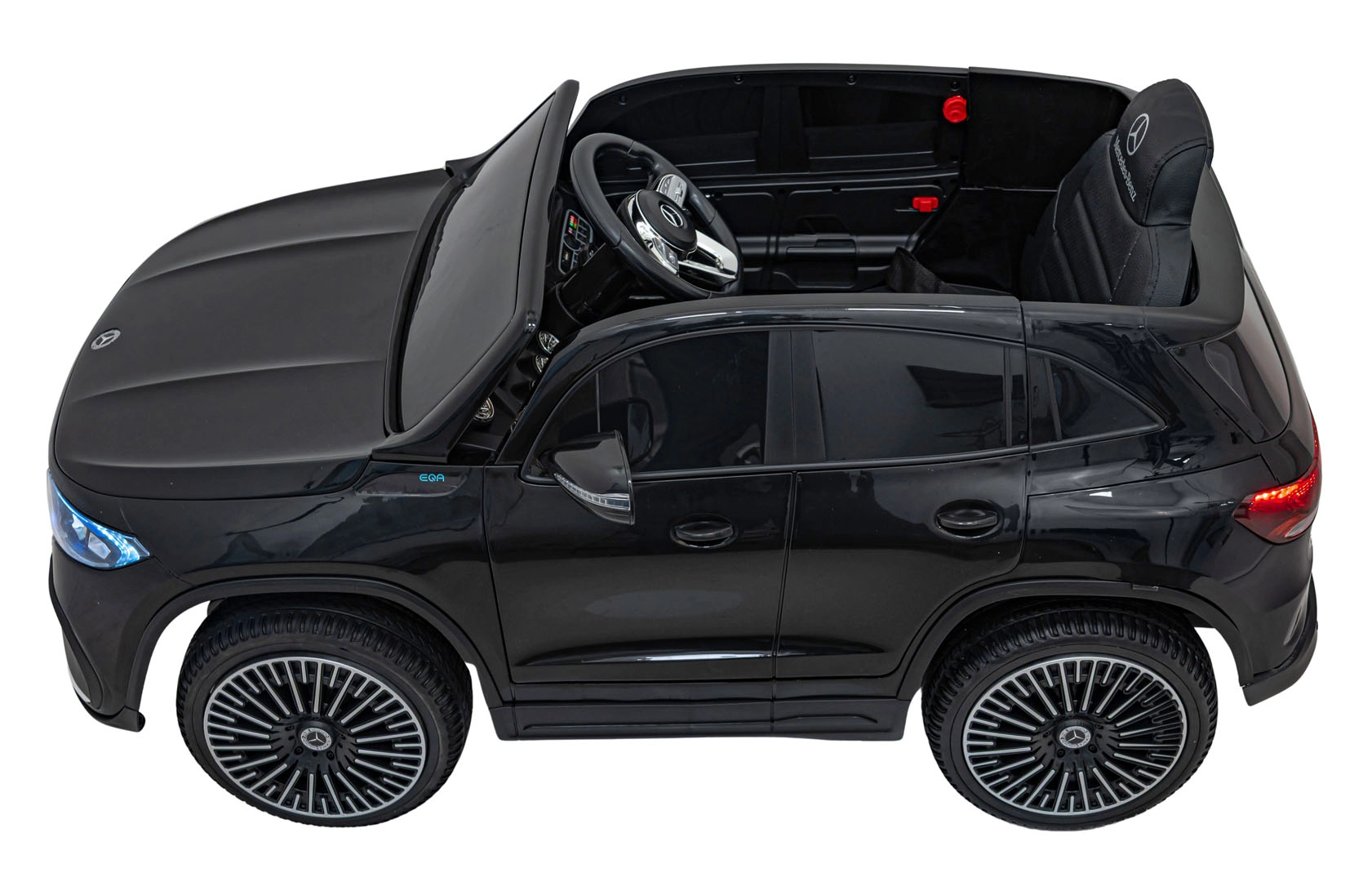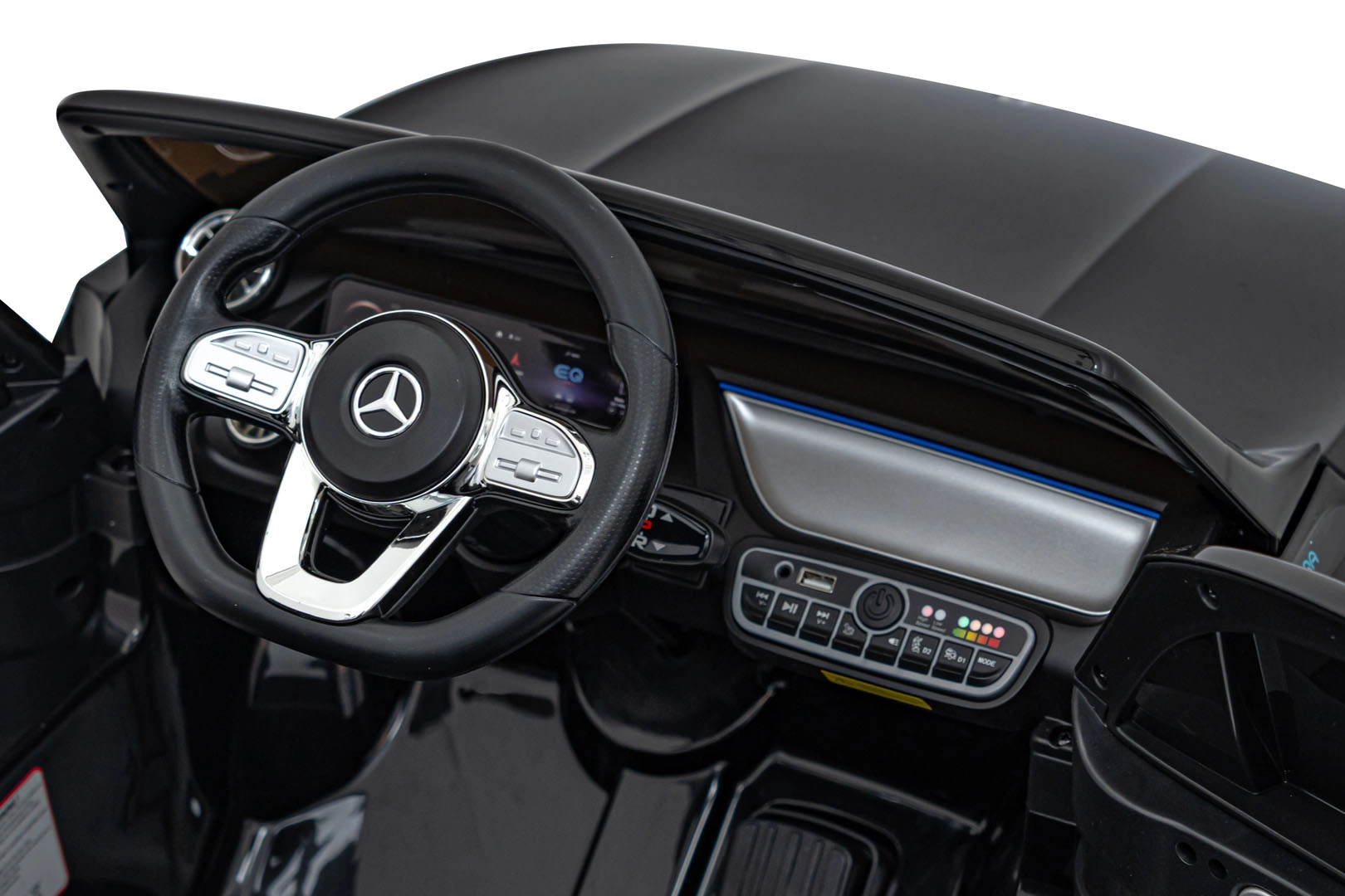 O zábavu sa stará multimediálny panel s Bluetooth, USB, AUX a MP3, nechýba klaksón a zvuky na volante ani indikátor nabitia. Vďaka diaľkovému ovládaniu 2,4 GHz môžu mať rodičia všetko pod kontrolou – vrátane bezpečnostného STOP. Interiér so sedadlom z eko kože a bezpečnostným pásom dopĺňajú LED predné aj zadné svetlá a autentické detaily EQA.