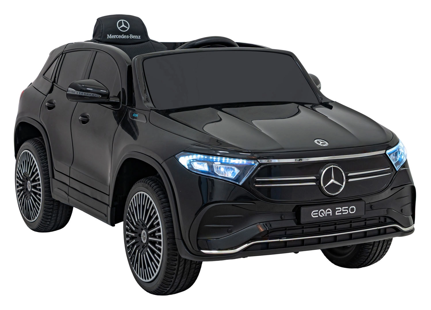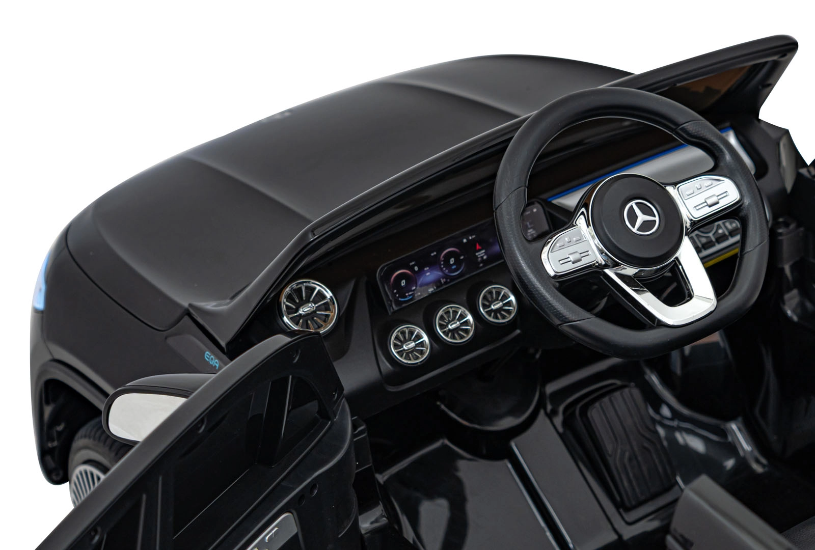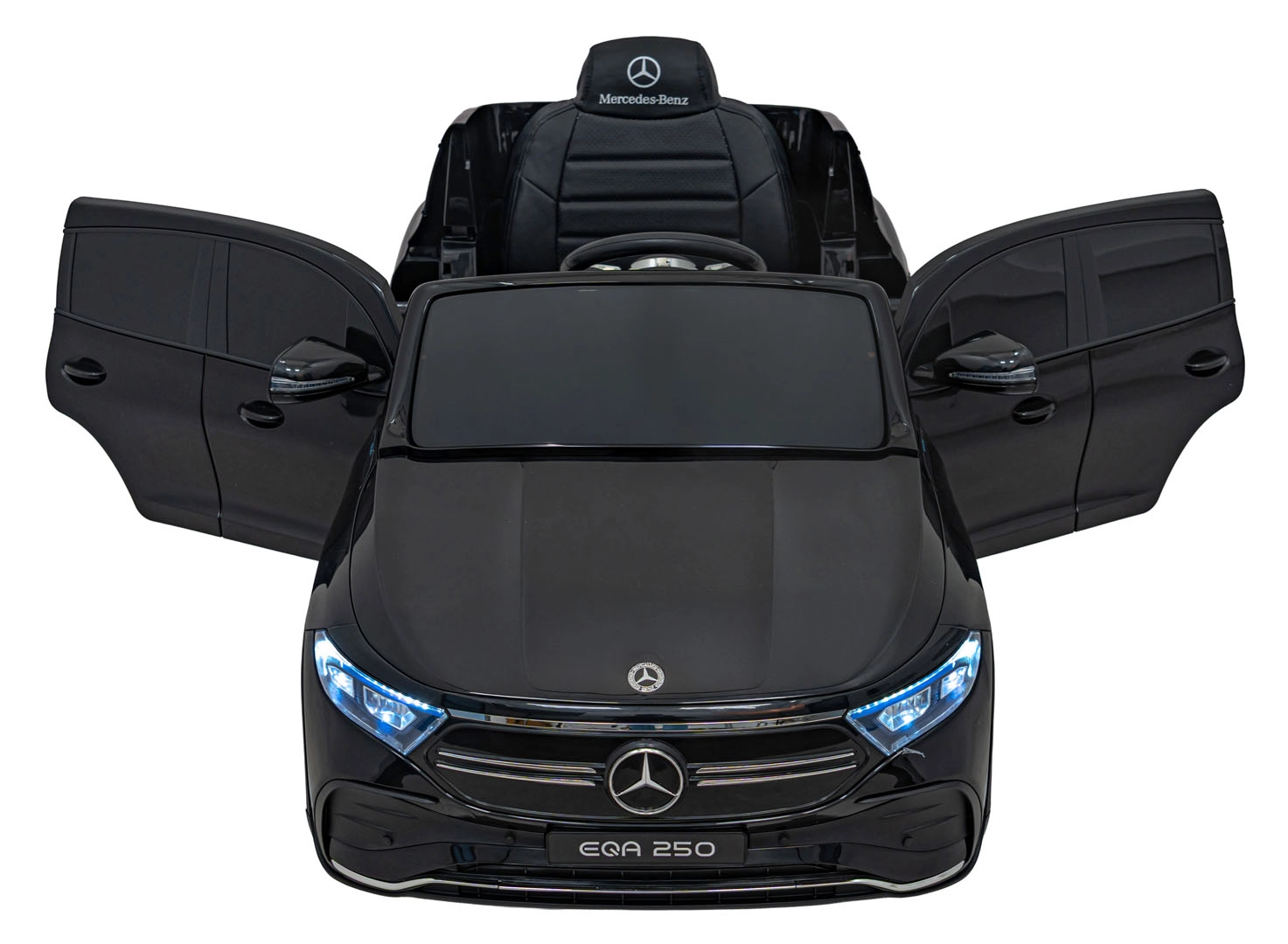 O zábavu sa stará multimediálny panel s Bluetooth, USB, AUX a MP3, nechýba klaksón a zvuky na volante ani indikátor nabitia. Vďaka diaľkovému ovládaniu 2,4 GHz môžu mať rodičia všetko pod kontrolou – vrátane bezpečnostného STOP. Interiér so sedadlom z eko kože a bezpečnostným pásom dopĺňajú LED predné aj zadné svetlá a autentické detaily EQA.