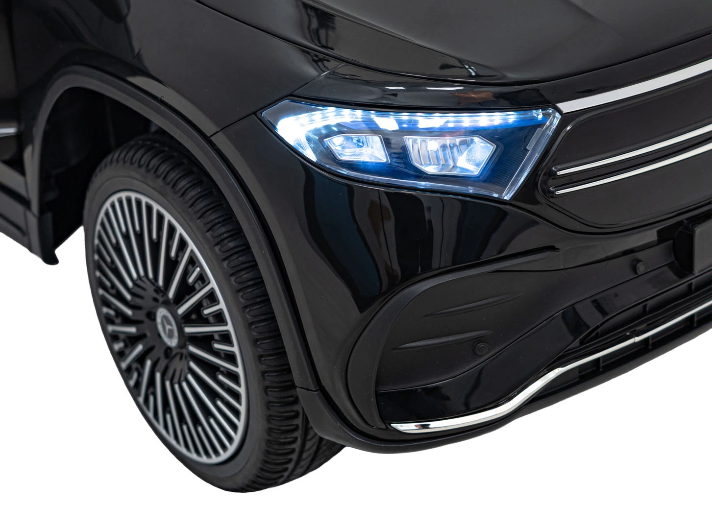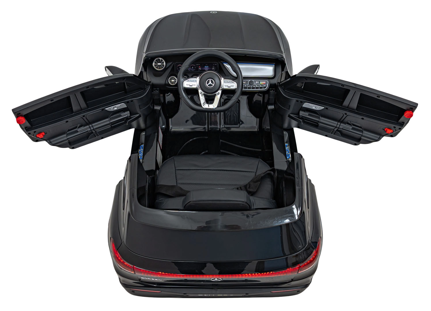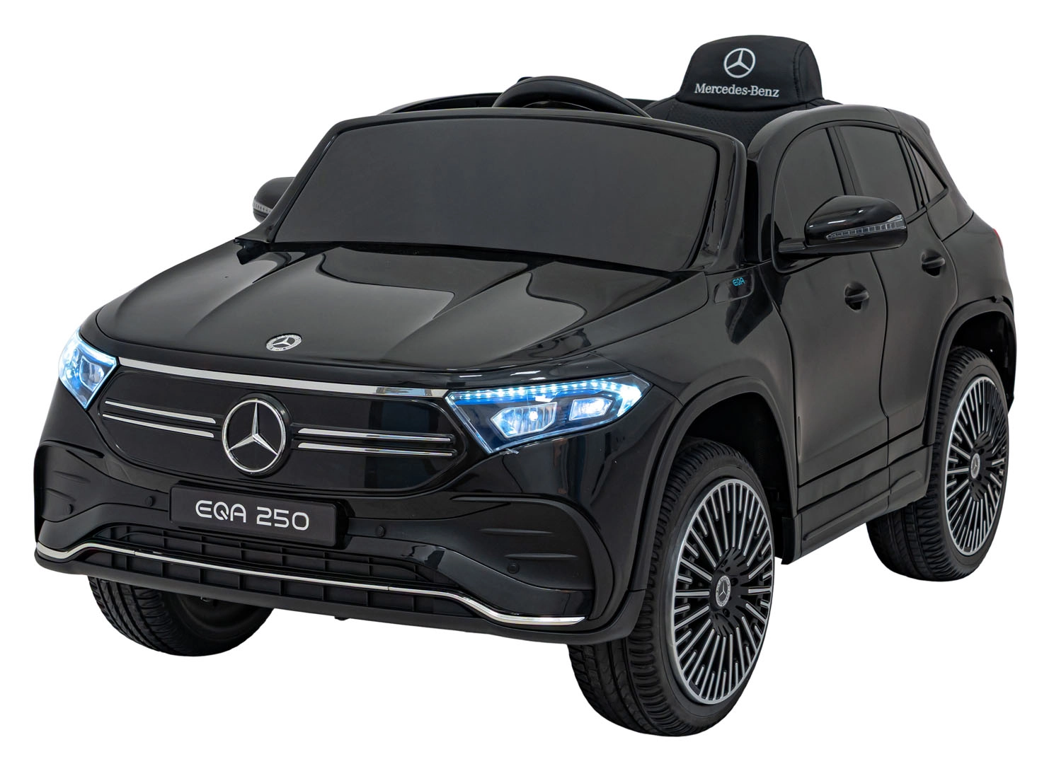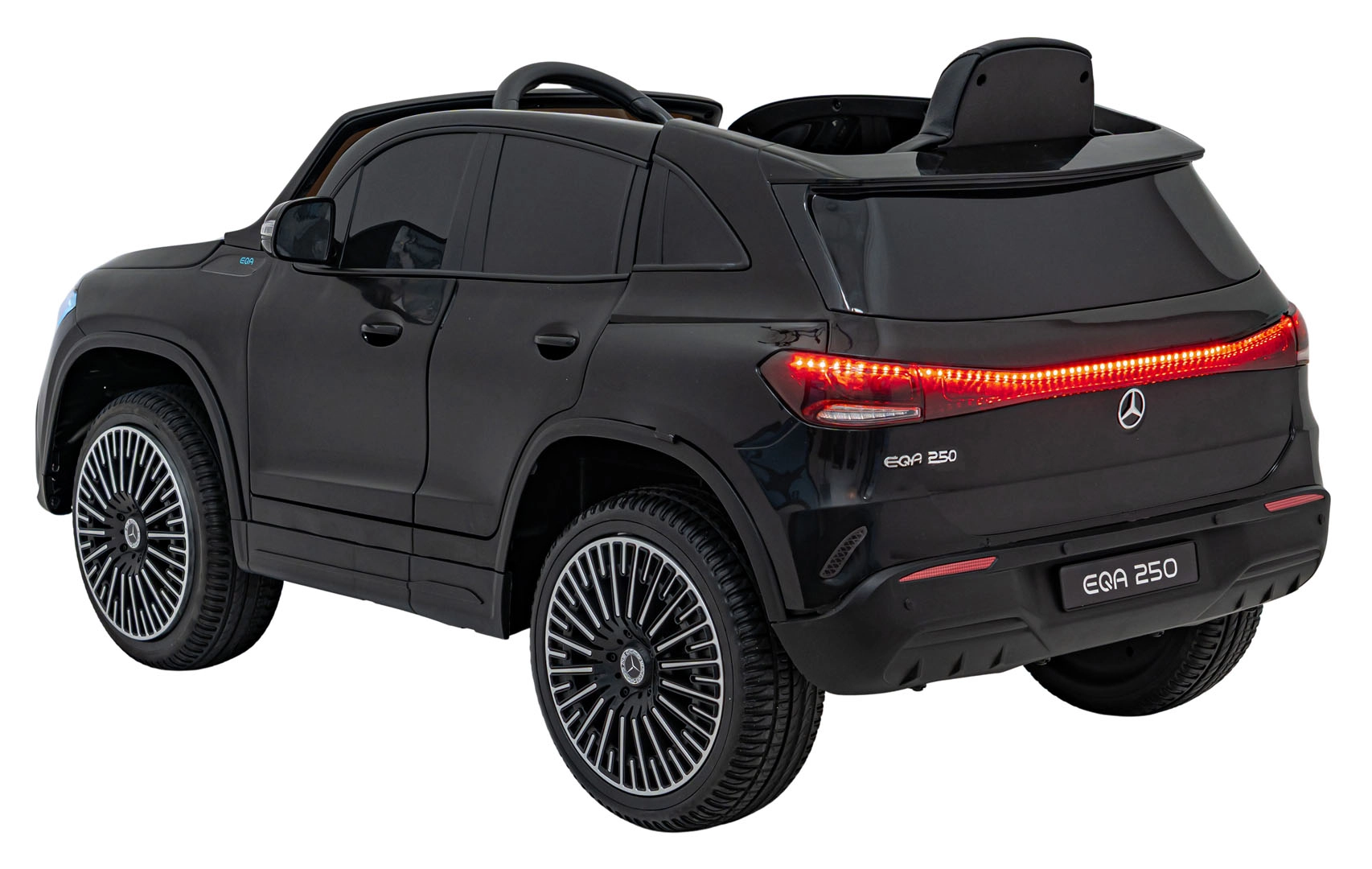 O zábavu sa stará multimediálny panel s Bluetooth, USB, AUX a MP3, nechýba klaksón a zvuky na volante ani indikátor nabitia. Vďaka diaľkovému ovládaniu 2,4 GHz môžu mať rodičia všetko pod kontrolou – vrátane bezpečnostného STOP. Interiér so sedadlom z eko kože a bezpečnostným pásom dopĺňajú LED predné aj zadné svetlá a autentické detaily EQA.