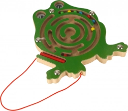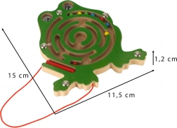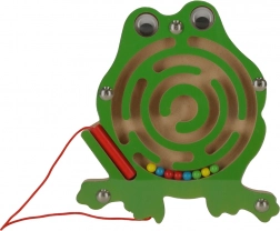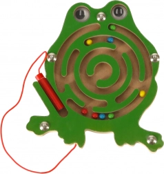 Tento drevený magnetický labyrint v tvare žabky zabaví deti na dlhé chvíle doma aj na cestách. Priložené magnetické pero na šnúrke pomáha viesť farebné guličky spletitými dráhami až do cieľového miesta. Priehľadný kryt zaisťuje, že guličky zostanú vždy vo vnútri hračky.