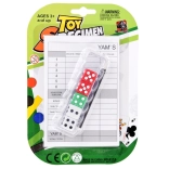 Peť klasických šesťstenných kociek, blok na skóre, ceruzka a odolné puzdro – pripravené na hru za okamih.