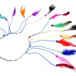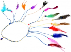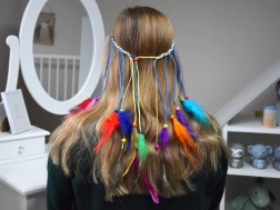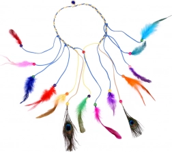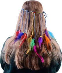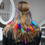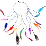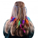 Urobte svojmu štýlu farebný upgrade s touto nádhernou boho čelenkou do vlasov. Je vyrobená z ľahkých, farebných pierok v intenzívnych odtieňoch - od tyrkysovej a žltej po červenú a zelenú. Kombinácia s drobnými, drevenými korálikmi a tenkými vrkočmi vytvorí efektívny a prirodzený vzhľad.