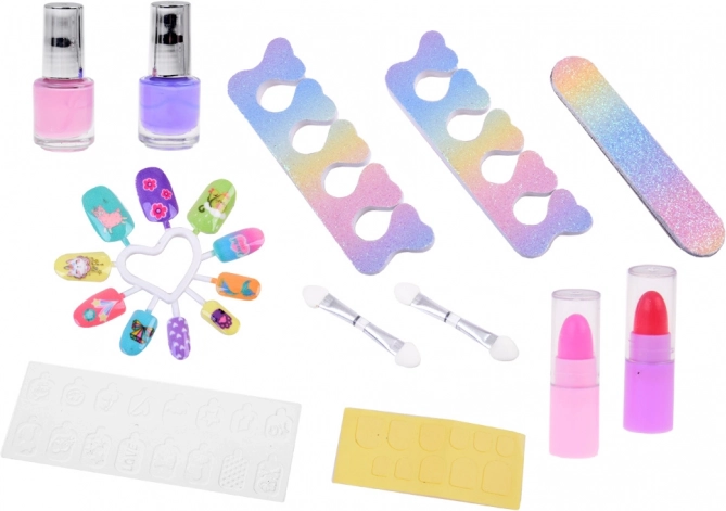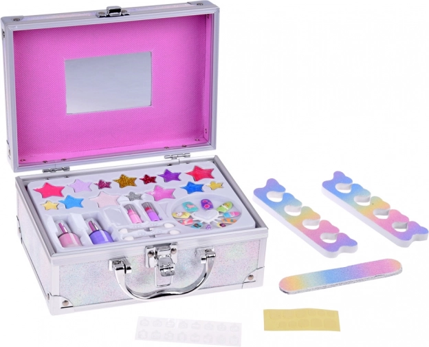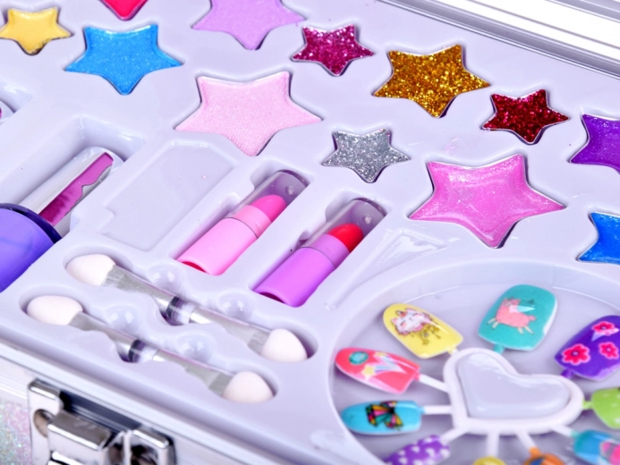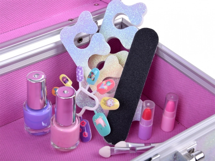 Kufrík obsahuje všetko potrebné pre zábavné líčenie: laky na nechty, rúže, očné tiene, aplikátory, nalepovacie nechty a nálepky. Pre jednoduchšie líčenie je vo vnútri aj zrkadielko.