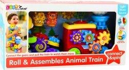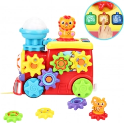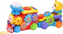 Veselý vláčik s prívesom a mackom je navrhnutý tak, aby nielen zabával, ale aj rozvíjal jemnú motoriku, pozornosť a predstavivosť dieťaťa už od prvých okamihov hry. Hračka je vybavená otáčajúcimi sa ozubenými kolesami, ktoré zapájajú ruky dieťaťa a pomáhajú rozvíjať presné pohyby. Svetelné a zvukové efekty stimulujú zmysly a uvádzajú dieťa do sveta audiovizuálnych podnetov. Uprostred vláčika sa nachádza pohybujúci sa obláčik a pred prívesom včielka, ktorá sa aktivuje otočením špeciálnej kľučky u macka.