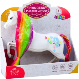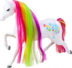 Tento nádherný biely kôň je snom každého malého milovníka rozprávok. S dlhou, dúhovou hrivou a pestrofarebným chvostom je ideálnou hračkou pre deti od 3 rokov. Kúzlo dopĺňajú jemné dekorácie a pastelové farby, ktoré očaria každé dieťa.