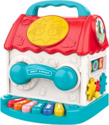 Súčasťou sady je 8 farebných magnetických červíkov, ktoré dieťa môže vyťahovať z otvorov pomocou špeciálneho magnetického ďatla. Tento úkon rozvíja koordináciu oko–ruka a precíznosť pohybov. Telefón vo forme hrkálky podnecuje k hre zvukom, zatiaľčo triedič tvarov so 4 blokmi učí deti rozpoznávať geometrické tvary. Každá zo stien domčeka má iné funkcie, ktoré povzbudzujú dieťa k objavovaniu a interakcii.
