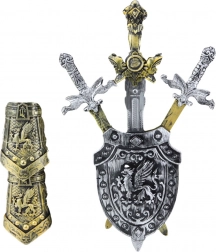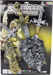 Táto sada obsahuje tri rôzne rytířske meče, vrátane jedného väčšieho, hlavnej zbrane bojovníka, zdobený štít s heraldickým motívom a dva chrániče na ruky napodobňujúce súčasti brnenia. Všetky diely sú vyrobené z ľahkého, ale odolného plastu, ktorý je bezpečný a odolný voči intenzívnemu hraniu.