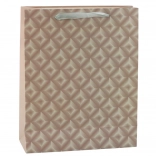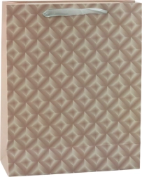 Táto darčeková taška je vyrobená z kvalitného, spevneného papiera. Povrch je zdobený geometrickým reliéfom, ktorý krásne odráža svetlo. Obsahuje saténové úchyty v jemnom odtieni, ktoré zabezpečujú pohodlné prenášanie a dodávajú taške jemný charakter.