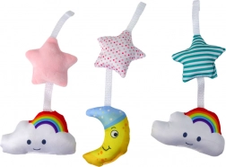 Sada obsahuje tri plyšové závesné hračky – mesiac, obláčik a hviezdu – navrhnuté s ohľadom na bezpečnosť a zmyslovú stimuláciu najmenších. Mäkké dotýkajúce sa postavičky v pastelových farbách pomáhajú rozvíjať zrak, dotyk a pohybovú koordináciu dieťaťa. Kolotoč povzbudzuje zvedavosť a poskytuje pocit pohodlia za všetkých okolností.