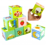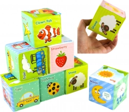 Kocky obsahujú rôzne obrázky – písmenká, číslice alebo slová v angličtine, čo podporuje jazykový a kognitívny vývoj dieťaťa. Každá kocka je navrhnutá tak, aby podporovala zmyslovú stimuláciu a rozvoj jemnej motoriky, čo umožňuje deťom kocky stavať, mačkať, hádzať a sledovať rôzne vzory a farby.