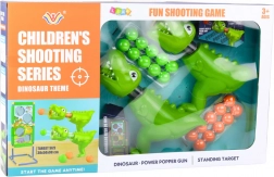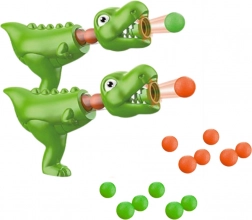 Súčasťou balenia sú dve vystreľovačky v tvare zelených dinosaurov, ktoré fungujú na princípe stlačeného vzduchu - stačí stlačiť a loptička energicky vystrelí smerom k terču. Použitie je intuitívne a bezpečné, nevyžaduje batérie ani nabíjanie. Vystreľovačky sú ľahké, vhodné pre detské ruky a umožňujú nabiť až 8 mäkkých guľôčok naraz, čo plynule zvyšuje zábavu bez častého prerušenia.