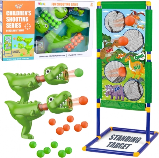 Súčasťou balenia sú dve vystreľovačky v tvare zelených dinosaurov, ktoré fungujú na princípe stlačeného vzduchu - stačí stlačiť a loptička energicky vystrelí smerom k terču. Použitie je intuitívne a bezpečné, nevyžaduje batérie ani nabíjanie. Vystreľovačky sú ľahké, vhodné pre detské ruky a umožňujú nabiť až 8 mäkkých guľôčok naraz, čo plynule zvyšuje zábavu bez častého prerušenia.