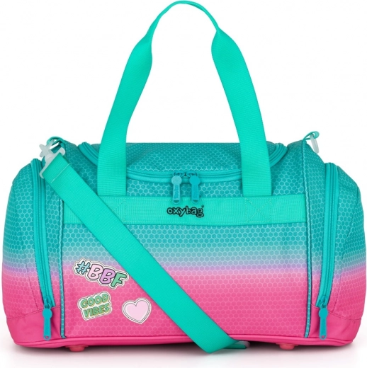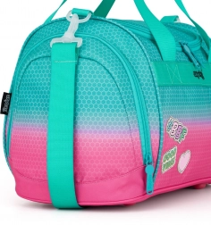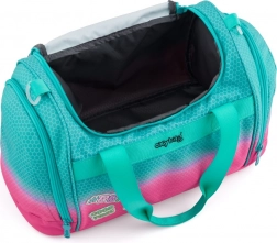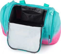 Taška sa pýši gradientným dizajnom, ktorý prechádza z tyrkysovej do ružovej. Táto štýlová kombinácia robí tašku nielen praktickou, ale aj módnou.