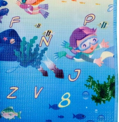 Obojstranná penová hracia podložka pre deti ponúka mäkké a bezpečné miesto na hranie aj učenie. Jedna strana zobrazuje morský svet s písmenami a číslami, druhá veselú zoo. Podložka izoluje od chladu, tlmí pády a ľahko sa čistí – stačí ju utrieť vlhkou handričkou.