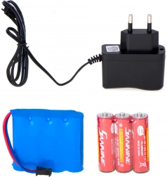Súčasťou je akumulátor 4,8 V 700 mAh, sieťová nabíjačka aj batérie do ovládača (3× AA). Stačí vybrať z balenia a vyraziť.