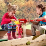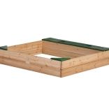 - Úložný priestor: Deti môžu ukladať svoje lopatky a kýblik do úložného priestoru s drevenými veko, ktoré môžu slúžiť aj ako lavičky.