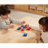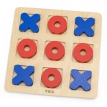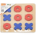 Súčasťou sady je drevená herná doska pre hru piškvorky a celkovo deväť farebných drevených prvkov - štyri modré 'X' a päť červených 'O'.