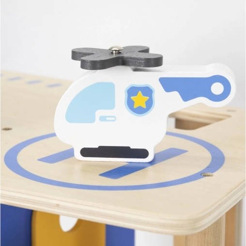 Súčasťou je bohaté príslušenstvo: figúrky 2 policajtov, zlodeja a policajného psa, ďalej policajné vozidlo, helikoptéra a doplnky na organizáciu zásahu. Deti si prirodzene precvičia sociálne zručnosti, spoluprácu, koordinačné schopnosti a rozvinú fantáziu.