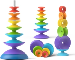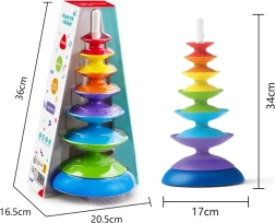 Táto vzdelávacia senzorická hračka kombinuje kreatívne hranie a rozvoj zručností. Dieťa môže skladať 7 farebných kotúčov podľa veľkosti či farby, nechávať ich kĺzať po špirále a neustále skúšať nové kombinácie. Skladacia veža podporuje jemnú motoriku, koordináciu ruka–oko a vnímanie tvarov a farieb.